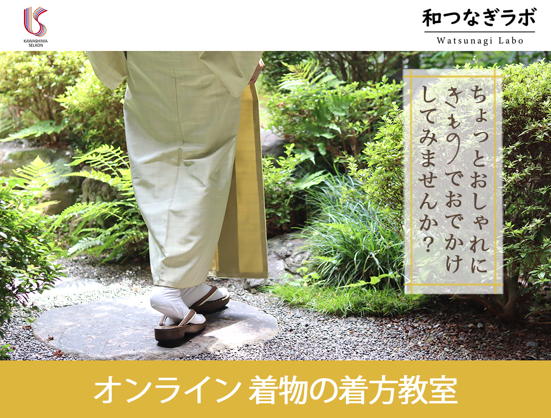 川島織物セルコンの着物の着方教室のご案内です。 着物の着方教室は、オンラインで開催しており、自宅などの好きな場所からご参加いただけます。 浴衣や着物、帯など5コースあり、いずれも1回完結(約90分)なので、お好きなコースを選んでご参加ください。