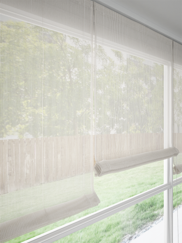 コットン調の糸・光沢糸・透明なフィルム糸の3 種の糸を並べて織り込んだストライプ柄です。ふんわりと柔らかく透明感があり、清潔感あふれる空間を作り出します。