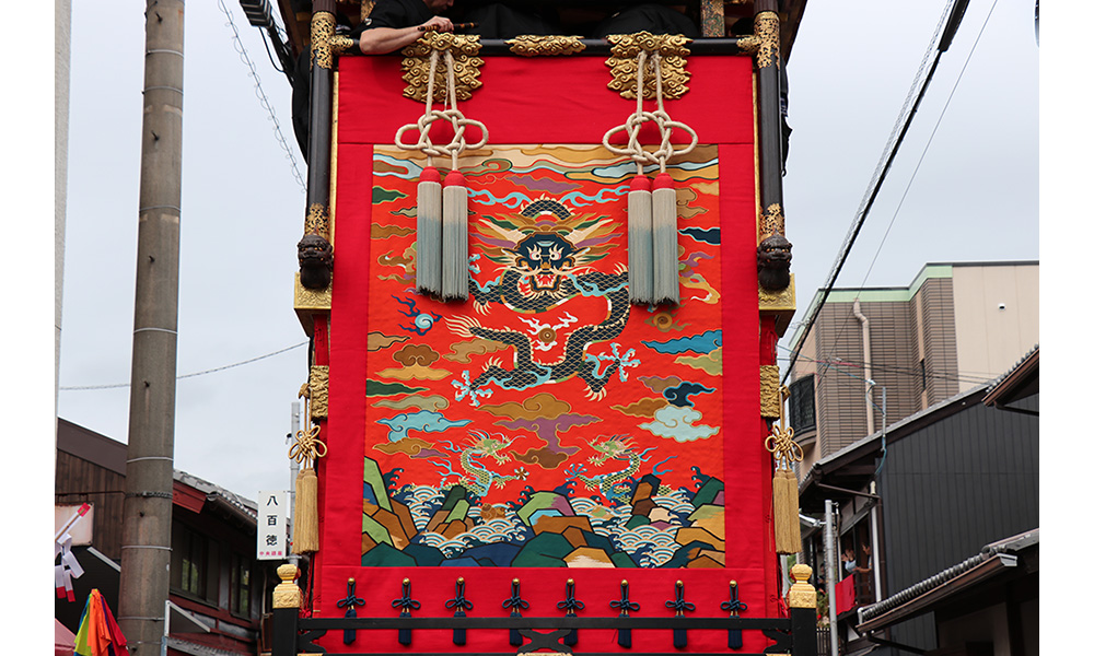 湖国三大祭の一つ、大津祭の曳山「西王母山(せいおうぼざん)」の見送幕「波濤龍雲図(はとうりゅううんず) 綴織」を復元新調しました。