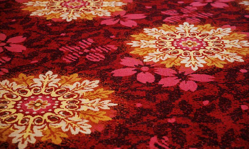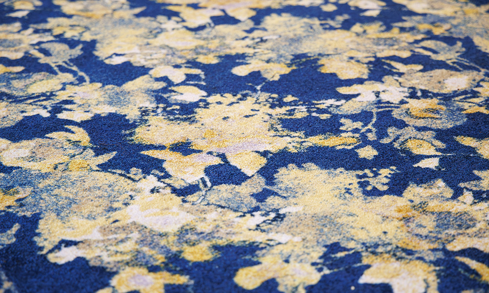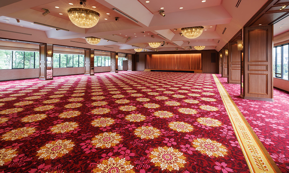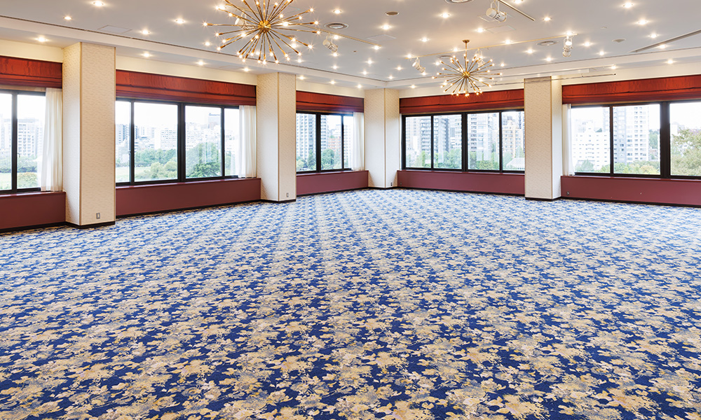 「桜の間」は、深紅を基調に桜の花と葉を散らし、その上にゴールドのクラシカルな紋をあしらった特注アキスミンスターカーペットで華やかで上品な和洋折衷の空間を演出しています。一方「桐の間」は、プリント技術を生かした繊細で華やかなパターンが特徴のタイルカーペットシリーズ「ピクタ」を使用。青をベースにクラシカルな花模様が映える、気品ある空間に仕上がりました。