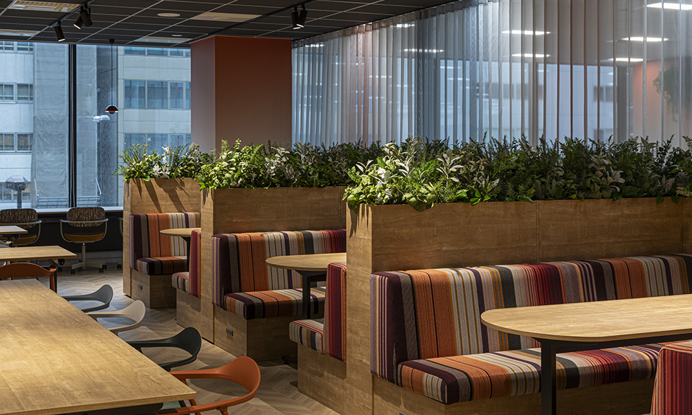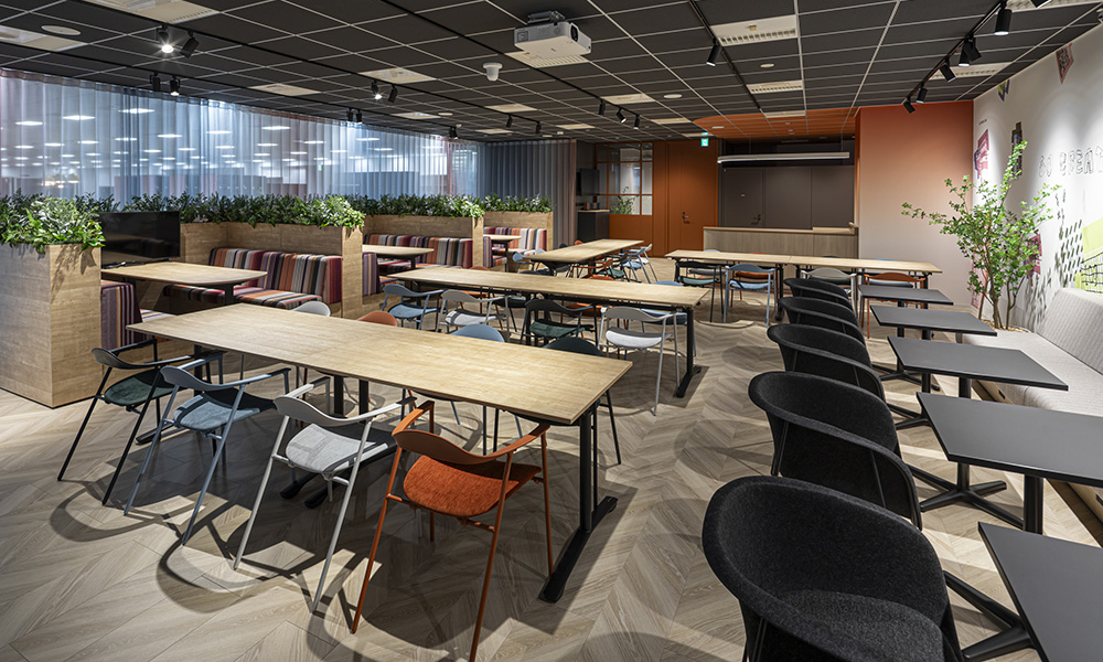床材とカーテンは、壁装や椅子、デスクなどの色に合わせたアイテムを使用しました。カフェスペースのカーテンは、ベーシックな無地のファブリックを壁装や家具の色に合わせてグラデーション加工し、各会議室のタイルカーペットは、椅子の色に合わせて床面の中心から外側に向けてグラデーションになるように配置しました。椅子やデスクなどのオフィス家具だけでなく、内装材も含めてカラーコーディネートをすることで、グラデーションによる緩やかな動きを持ちながら、それぞれの空間で全体につながりが生まれています。