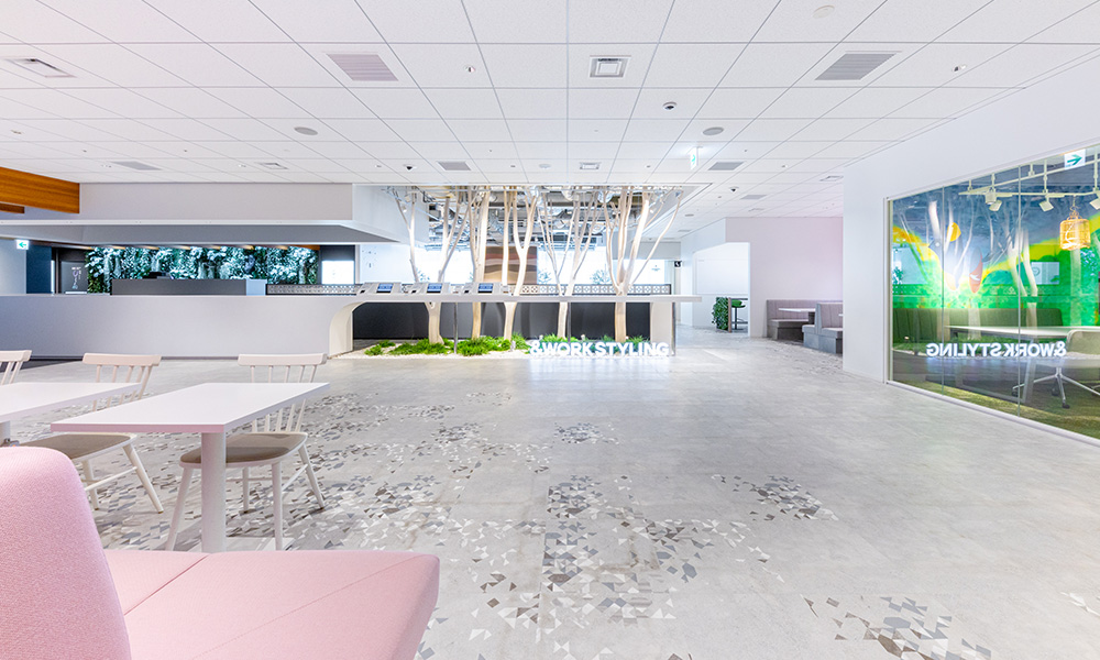 「ワークスタイリング」は、三井不動産株式会社が運営するシェアオフィス・レンタルオフィスです。2023年2月、JR東京駅八重洲口直結の大型複合施設「東京ミッドタウン八重洲」に新たな拠点をオープンし、置き敷きビニル床タイル(リファインバックエグザ)とタイルカーペット(アートバンク)を採用いただきました。