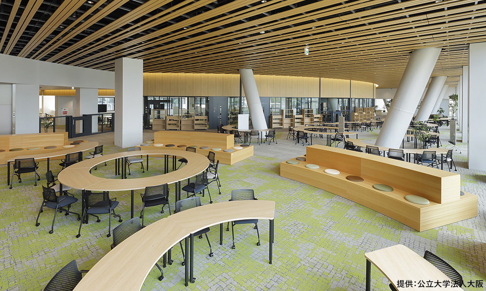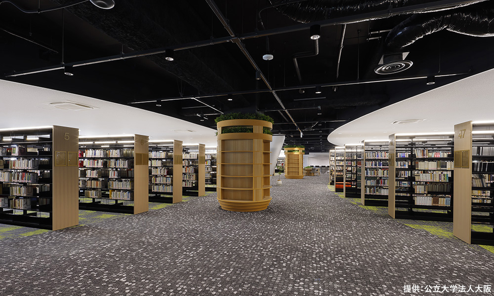 大阪公立大学 森之宮キャンパスは「知の森」をコンセプトとした、多様な学びと交流を育む都市型高密度キャンパスです。その中心的施設であるライブラリーは、学生や教職員だけでなく、地域住民やコミュニティ、企業との連携やコミュニケーションを促し、イノベーションを生み出す場としての役割を担っています。内装は、さまざまなフロアをつなぎながら、人と人との出会いを促すように緩やかな曲線でデザインされています。