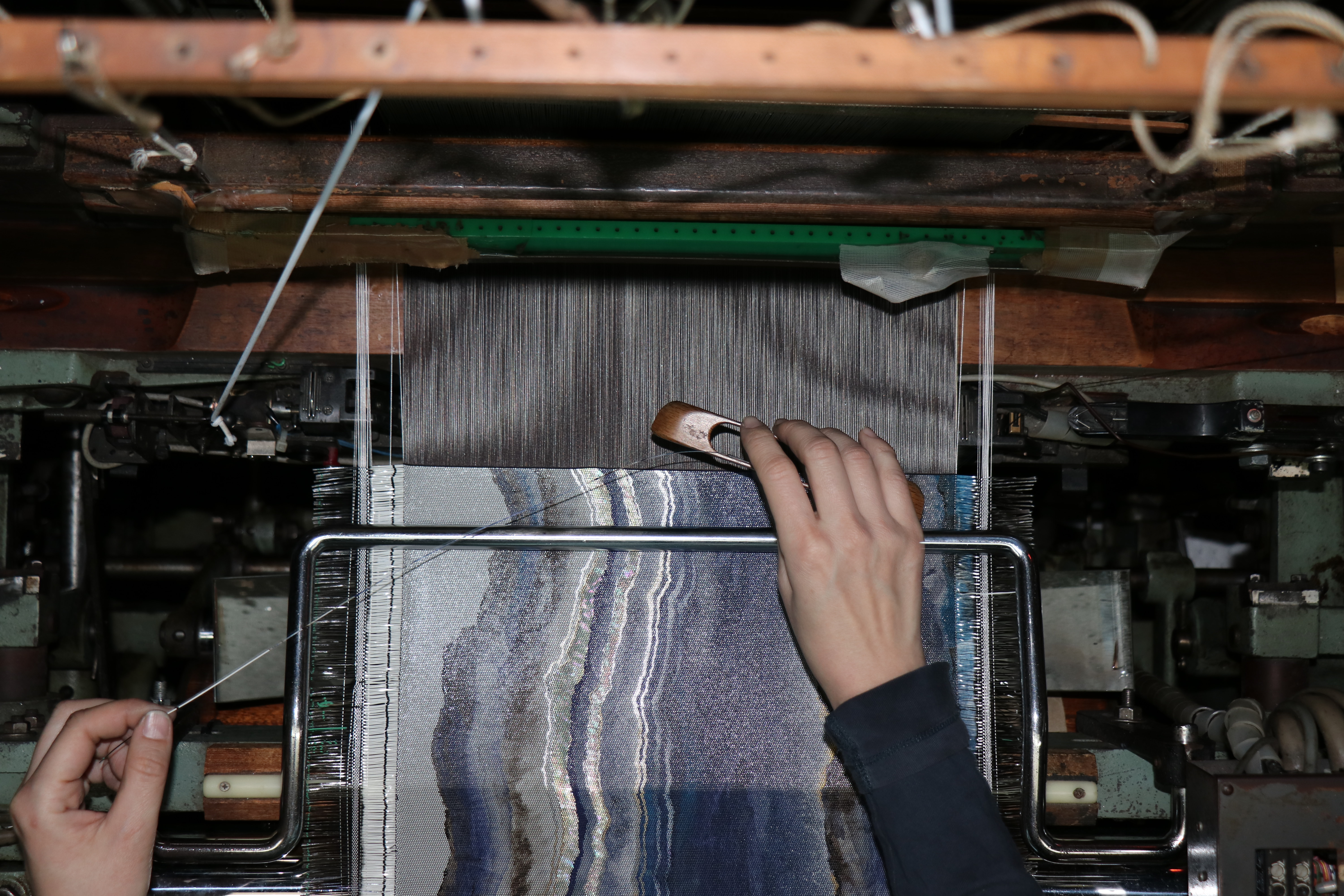 川島織物セルコンは創業以来、織の技術を積み重ね、「技術の地層」を形成してきました。手織りの迫力ある綴織アートワークをはじめ、絹糸や金糸、螺鈿、フィルムなどを織り込んだ繊細できらめきのある織物、さらにはリアルな質感を追求した実用的な機械織り作品まで、180年以上にわたる技術と挑戦の堆積を、多様な織物表現として紹介します。