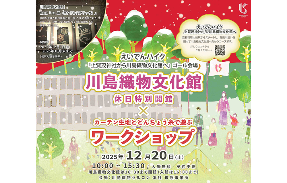 近隣の鉄道「叡山電車 」が年間を通じて実施される「えいでんハイク」。沿線の駅をスタートし、社寺などの名所や山道を散策しながらゴールを目指すハイキング企画です。12月20日(土)に開催のえいでんハイクは、京都精華大前駅をスタートし、上賀茂神社、鴨川公園などを通ってゴールの川島織物文化館を目指します。京都のハイキングを楽しんだ後に、ぜひお立ち寄りください。