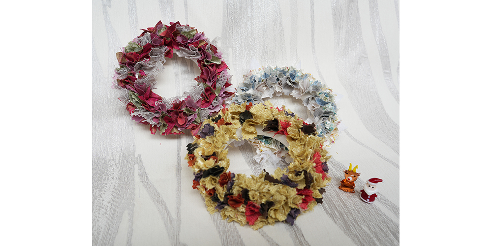 カーテンのハギレを使ってファブリックリースを作ります。さまざまなハギレから、お好きなものを選んで、オリジナルのリースに仕上げます。(対象年齢 10歳~)