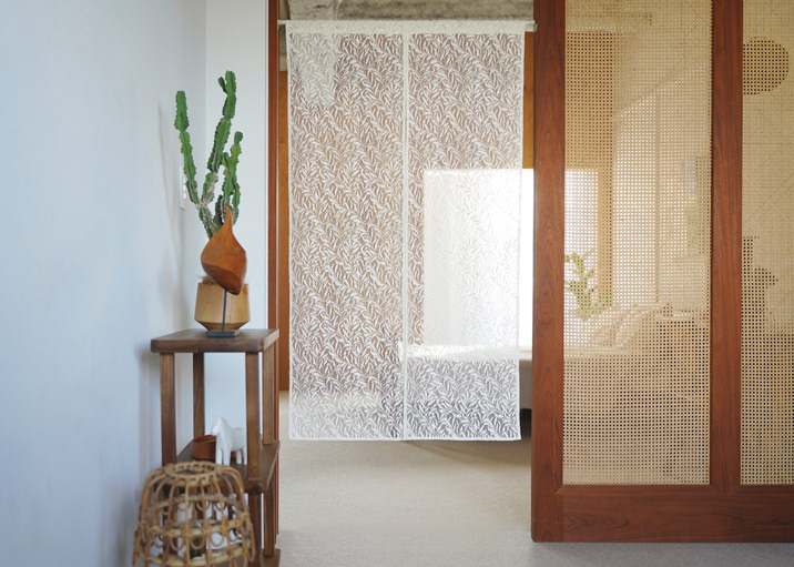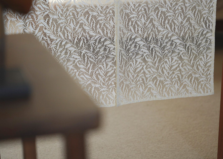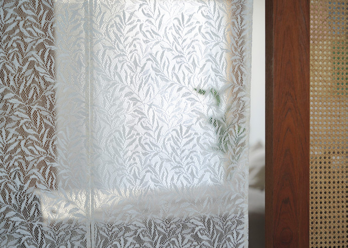 ウィローボウのデザインは、1887年に製作されたウィリアム・モリスの壁紙のデザインが元になっています。 自邸近くのテムズ川の土手の柳からアイデアを得て作られた柄で、柳の枝の流れと、細長い柳の葉で全面が埋め尽くされています。 ボリュームのある編みレースで柳の枝を表現しました。