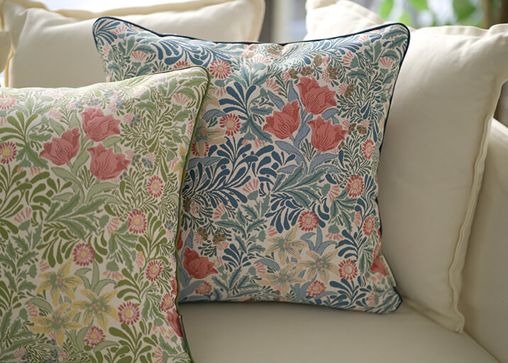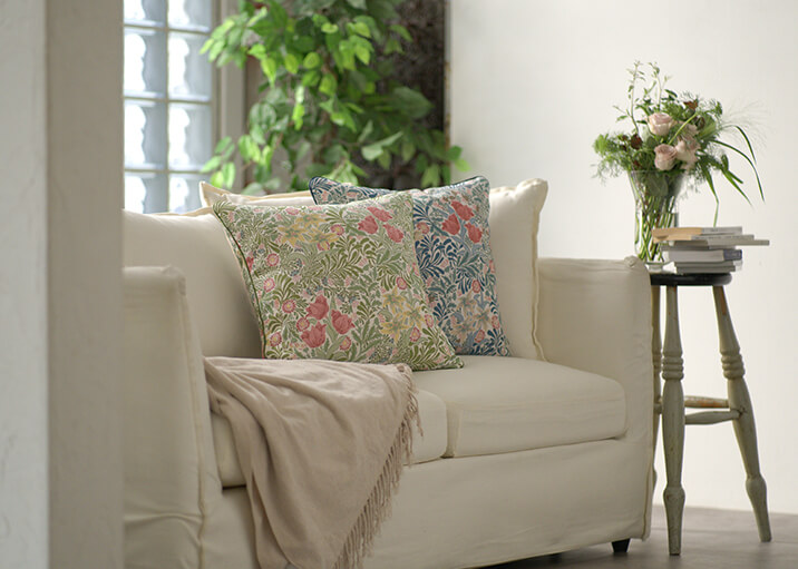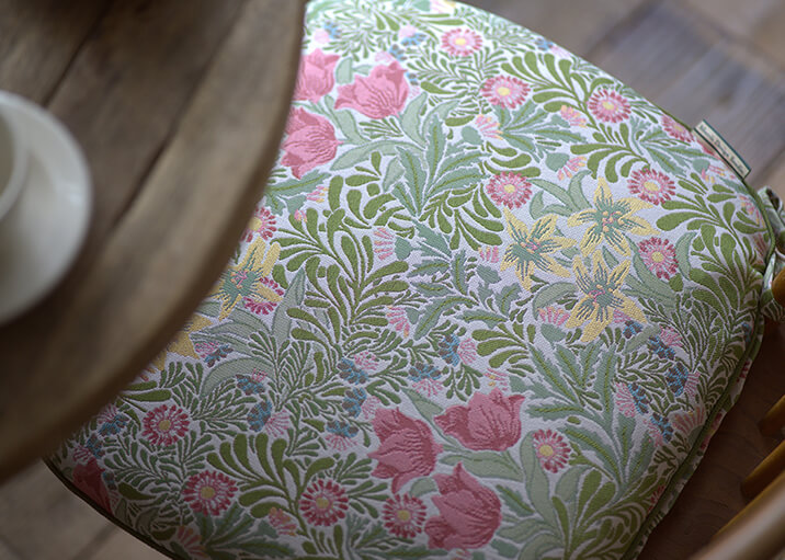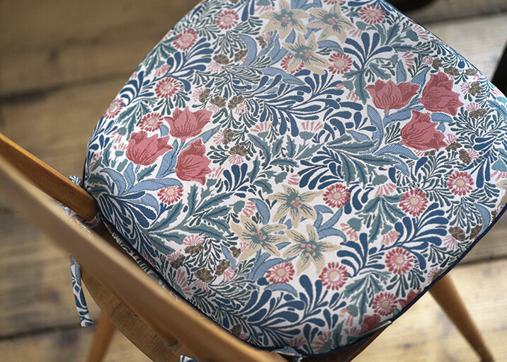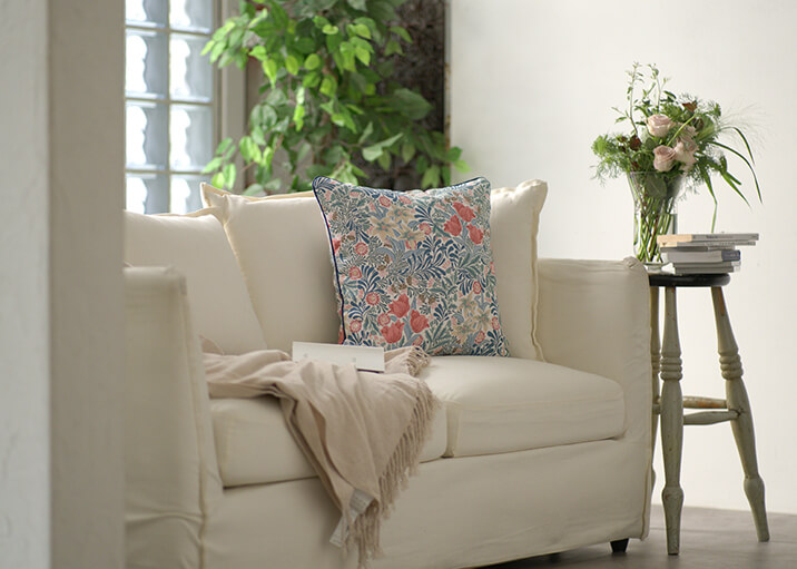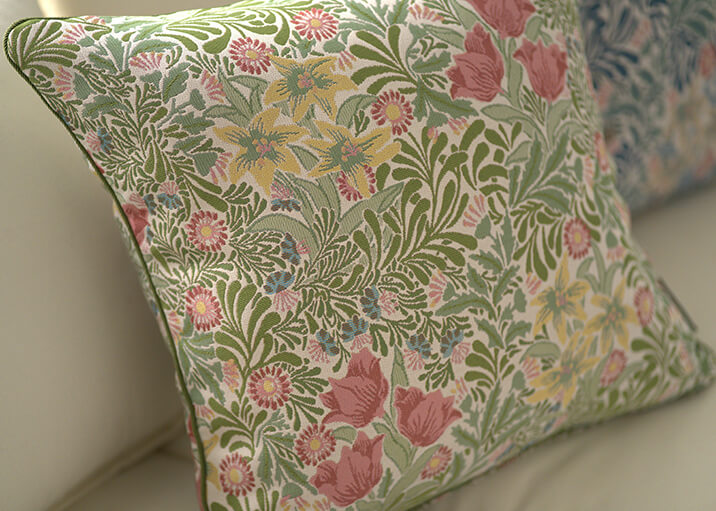 1877年にウィリアム・モリスのデザインとして登録された柄で、咲き誇る花々と生命力に満ちた葉が織りなす、楽園のような情景を描いています。重なり合う葉の表情には、織りの立体感と色彩の奥行きが巧みに表現され、空間に深みをもたらします。ナチュラルな風合いのベースの上に、多彩な色使いと光沢のある花々が際立ち、華やかさと上品さが共存する仕上がりとなっています。