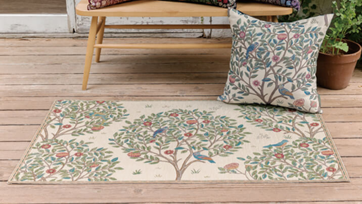 ウィリアム・モリスの次女メイが別荘「ケルムスコット・マナー」で使われていたベッド周りのカーテンをヒントに、刺繍で表現したデザインを、マット用にアレンジしました。
