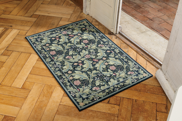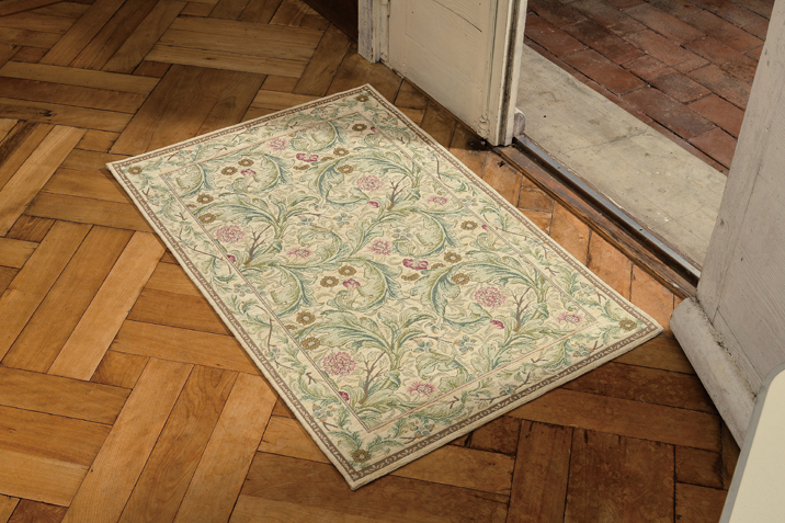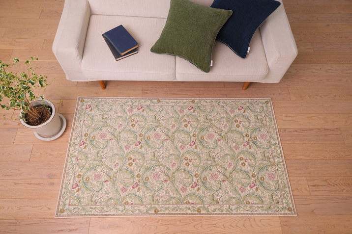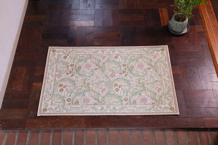 1912年にウィリアム・モリスの一番弟子である、ジョン・ヘンリー・ダールがデザインしたものです。大きくうねるアカンサスの葉、赤いカーネーション、丸くて黄色いメランポジウム(キク科の花)、ブルーで描かれているオダマキの花たちが表情豊かに描かれています。