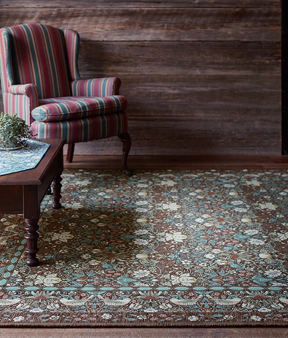 時代を超えて愛されるウィリアム・モリスの代表作の一つで、モリスの別荘である「ケルムスコット・マナー」でいちごをついばむツグミを見て描いたデザインです。1882~1885年にモリス商会のマートンアビー工房で製作されていたハンドプリントを織物にしました。