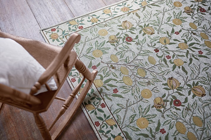 ウィリアム・モリスのデザインの中でも有名なこのフルーツの柄は、1864年にモリスが第二作目の壁紙として描いたもので、当時は版木を用いてハンドプリントされていました。 版木のやわらかく味わいのあるタッチを織物で表現しています。