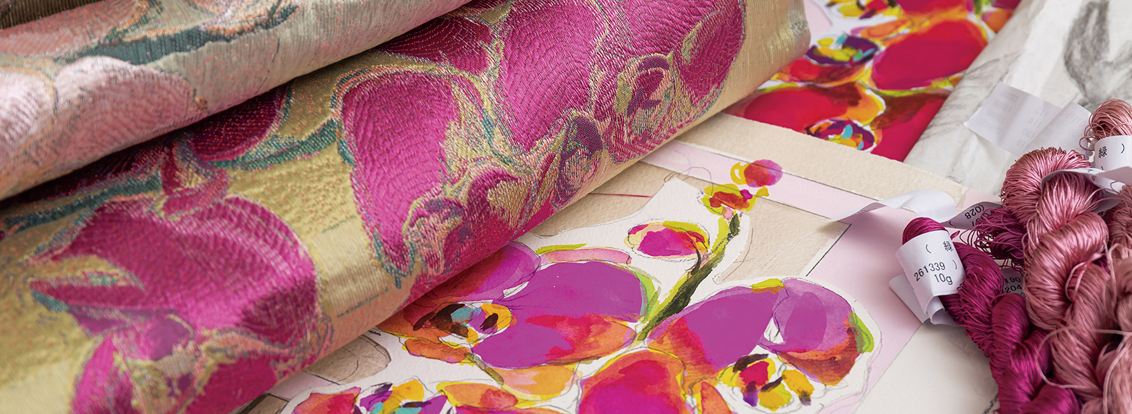 - 胡蝶蘭の花と幾何学模様とのモダンな構成柄。凛とした花と直線的な幾何柄の出合いが新鮮です。ヨコ糸を刺繍のように織り込み、蘭の花の持つ気品と高級感を表現しました。花びらの厚みまで感じとることができる、豊かな織表現が魅力です。