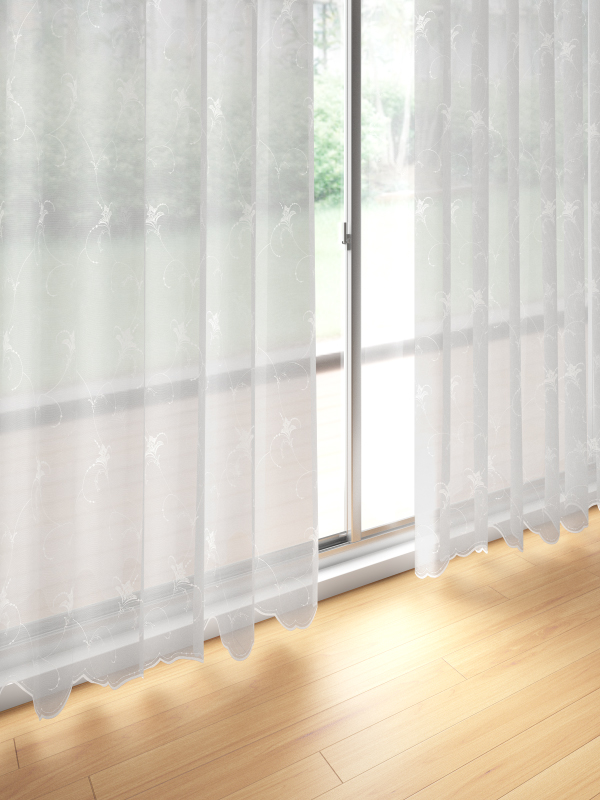 オーガンジーのような柔らかい透け感が魅力のレースです。気品あるサラサ刺繍とすっきりとした裾スカラップはさまざまなドレープに寄り添います。防炎機能もあり、お使いいただけるシーンも広がります。