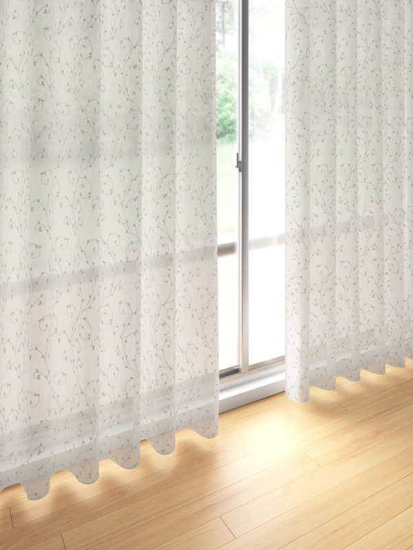 国産防炎刺繍の小さなリーフ総柄です。ドレープの柄感、窓サイズやお部屋を選ばず合わせていただけます。配色によって、モダンにもエレガントにもコーディネートできる商品です。