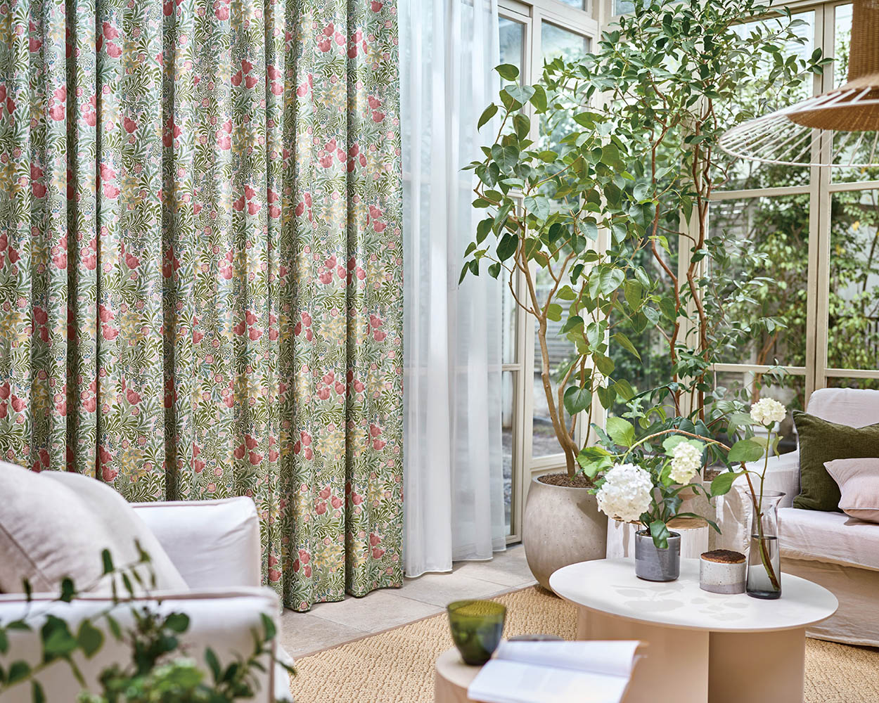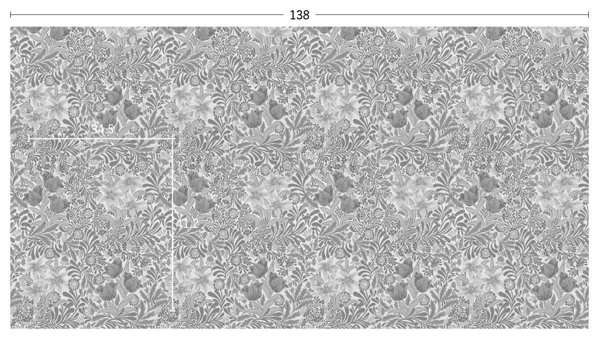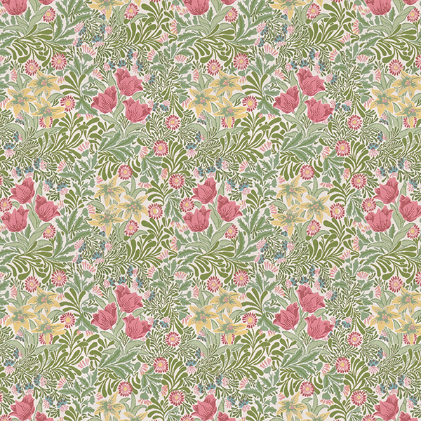 1877年にウィリアム・モリスのデザインとして登録された柄で、咲き誇る花々と生命力に満ちた葉が織りなす、楽園のような情景を描いています。重なり合う葉の表情には、織りの立体感と色彩の奥行きが巧みに表現され、空間に深みをもたらします。ナチュラルな風合いのベースの上に、多彩な色使いと光沢のある花々が際立ち、華やかさと上品さが共存する仕上がりとなっています。