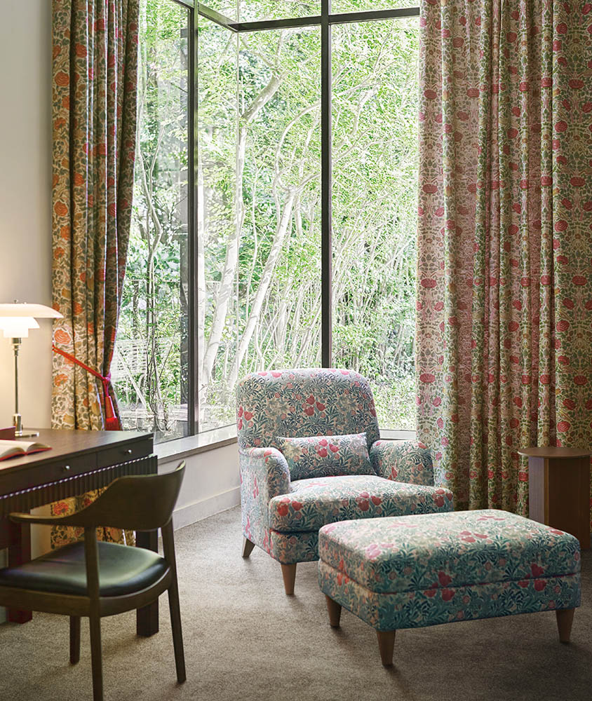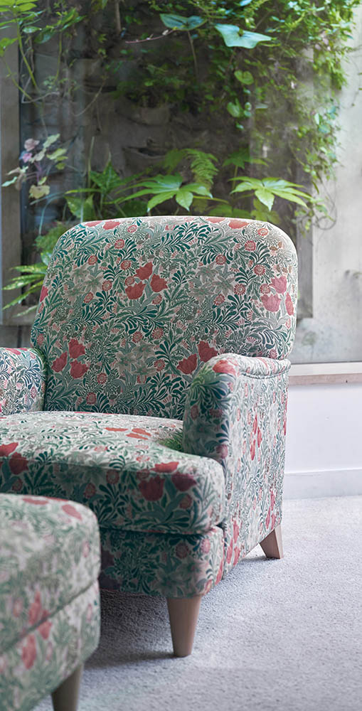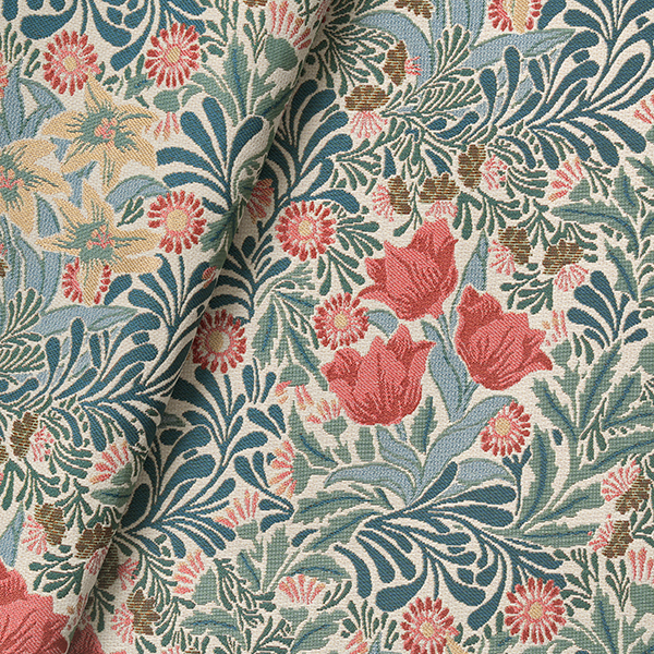1877年にウィリアム・モリスのデザインとして登録された柄で、咲き誇る花々と生命力に満ちた葉が織りなす、楽園のような情景を描いています。重なり合う葉の表情には、織りの立体感と色彩の奥行きが巧みに表現され、空間に深みをもたらします。ナチュラルな風合いのベースの上に、多彩な色使いと光沢のある花々が際立ち、華やかさと上品さが共存する仕上がりとなっています。