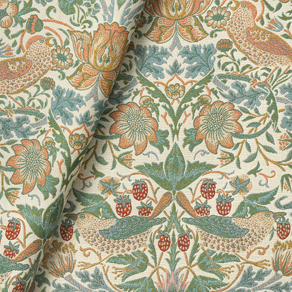 これまでのクラシカルなイメージから一新し、柔らかく優雅な配色を新たに取り入れています。織り組織や表現のこだわりはそのままに、オフホワイトのベースに柄が映えるよう、シルエットが美しく浮かび上がる色調を採用しました。明るく爽やかな印象を保ちつつ、高級感も感じられる仕上がりとなっています。