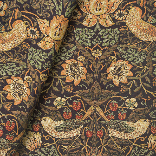 時代を超えて愛されるウィリアム・モリスの代表作の一つで、モリスの別荘である「ケルムスコット・マナー」でいちごをついばむツグミを見て描いたデザインです。1883年にモリス商会のマートンアビー工房で製作されていたハンドプリントを織物にしました。