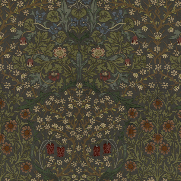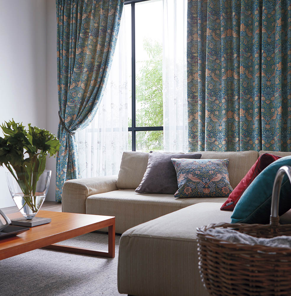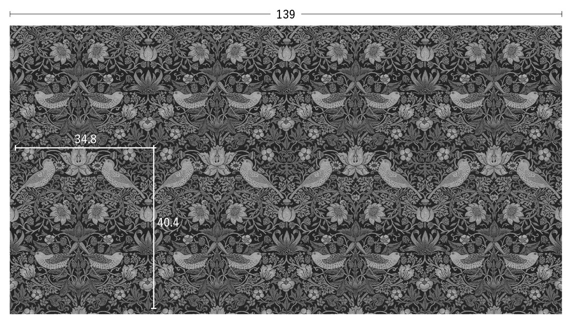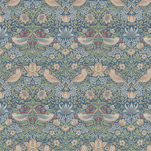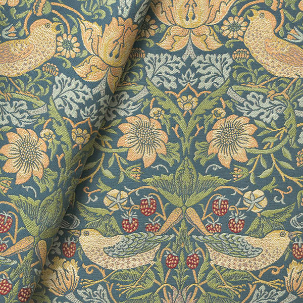 時代を超えて愛されるウィリアム・モリスの代表作の一つで、モリスの別荘である「ケルムスコット・マナー」でいちごをついばむツグミを見て描いたデザインです。1883年にモリス商会のマートンアビー工房で製作されていたハンドプリントを織物にしました。