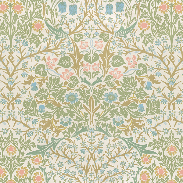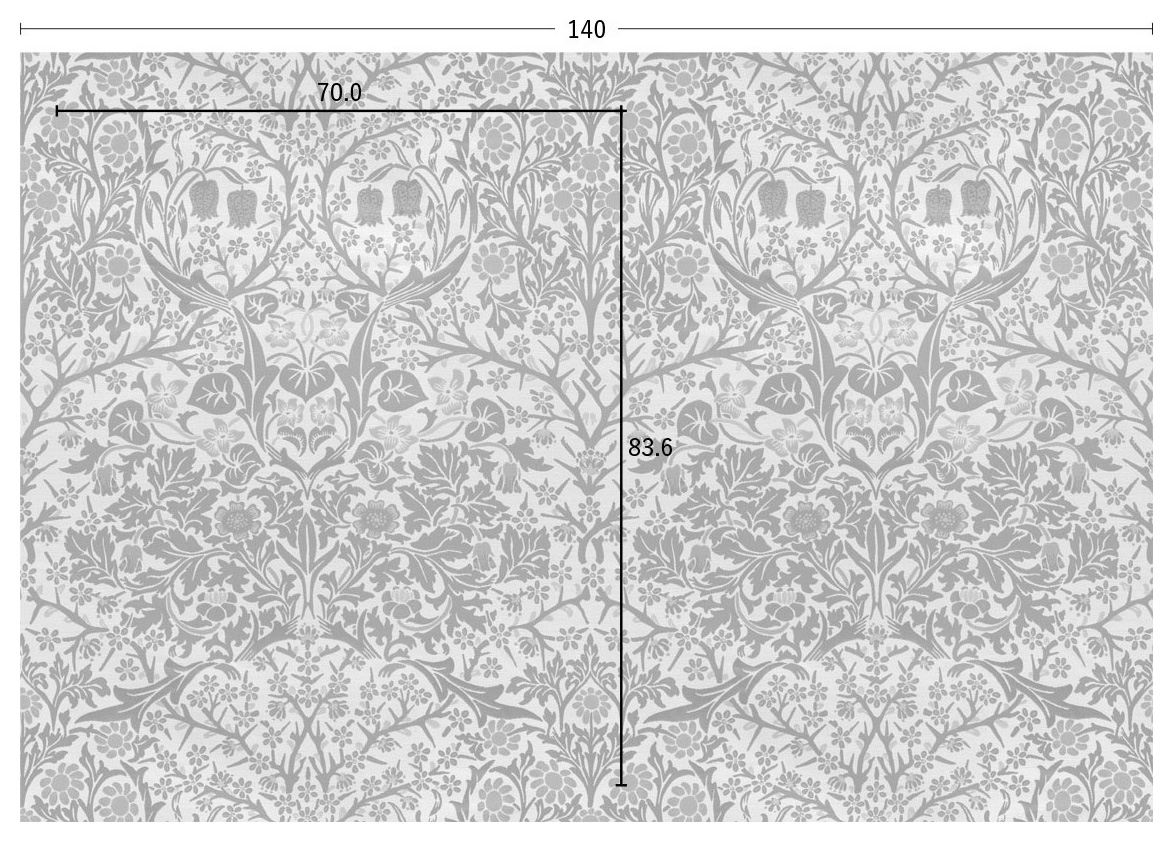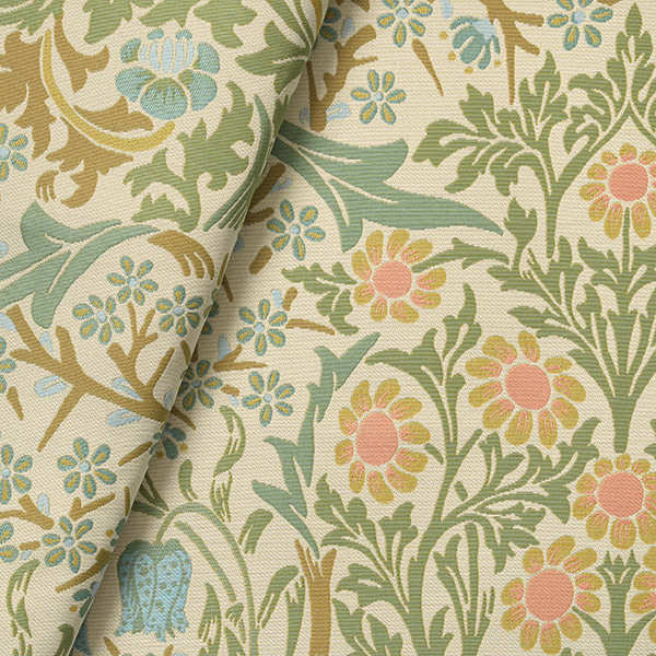 オリジナルとは異なり、明るくすっきりとしたエレガントなイメージに仕上げました。全体的にややマットな質感を持ち、色調は落ち着いたパステルカラーで統一しています。ベースには意匠糸を用い、葉の一部には風通組織を取り入れることで、織りに豊かな表情を添えています。