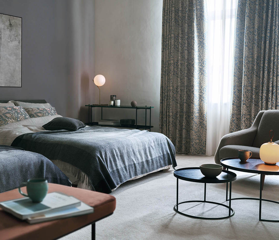 モリスの人気柄の織物の遮光商品です。織物ならではの端正な表情はそのままに、柄や色、織り方にアレンジを加え、遮光2級を実現しました。モダンなカラーはリビングのみならず、寝室など、幅広くご提案いただけます。