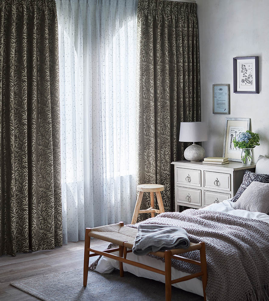 モリスの人気柄の織物の遮光商品です。織物ならではの端正な表情はそのままに、柄や色、織り方にアレンジを加え、遮光2級を実現しました。モダンなカラーはリビングのみならず、寝室など、幅広くご提案いただけます。
