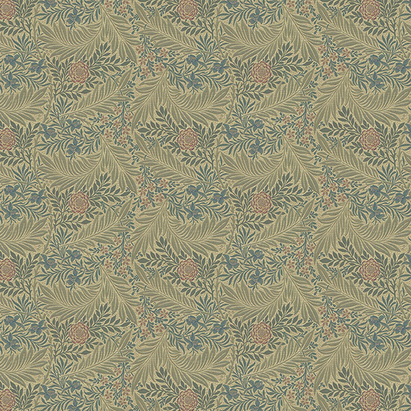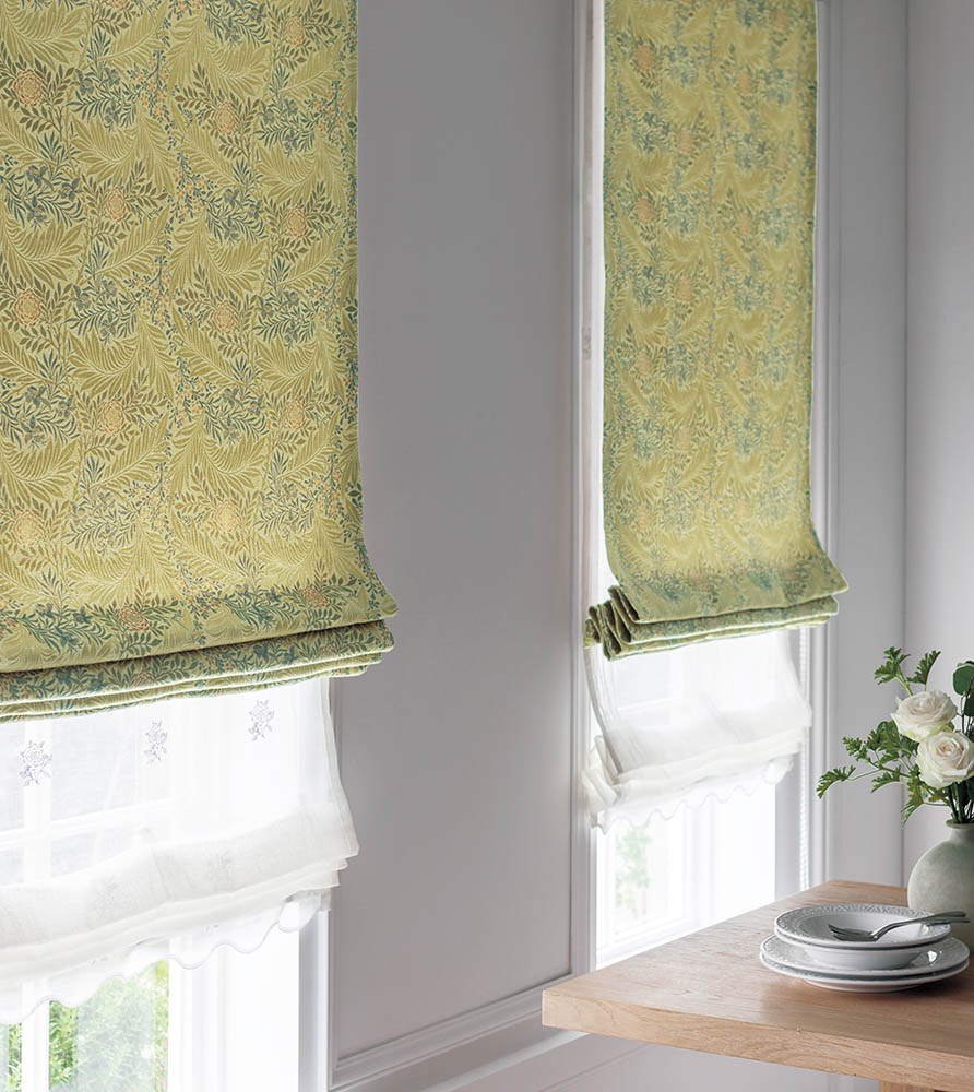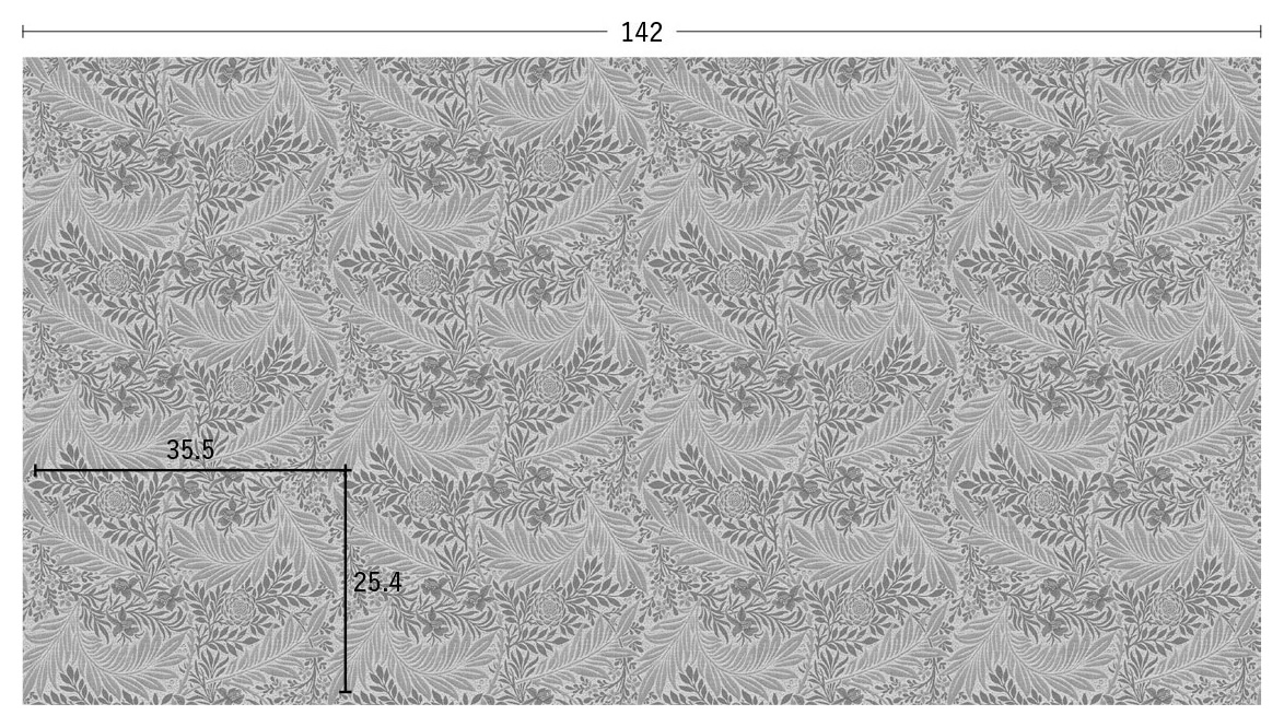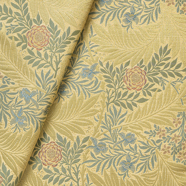 飛燕草(ひえんそう/デルフィニュウム)をモチーフに、1875年に製作されたウィリアム・モリスの壁紙のデザインを織物にしました。糸の光沢差を利用し織り方を工夫することで、花の細部まで丁寧に表現しています。