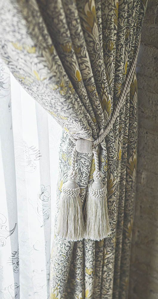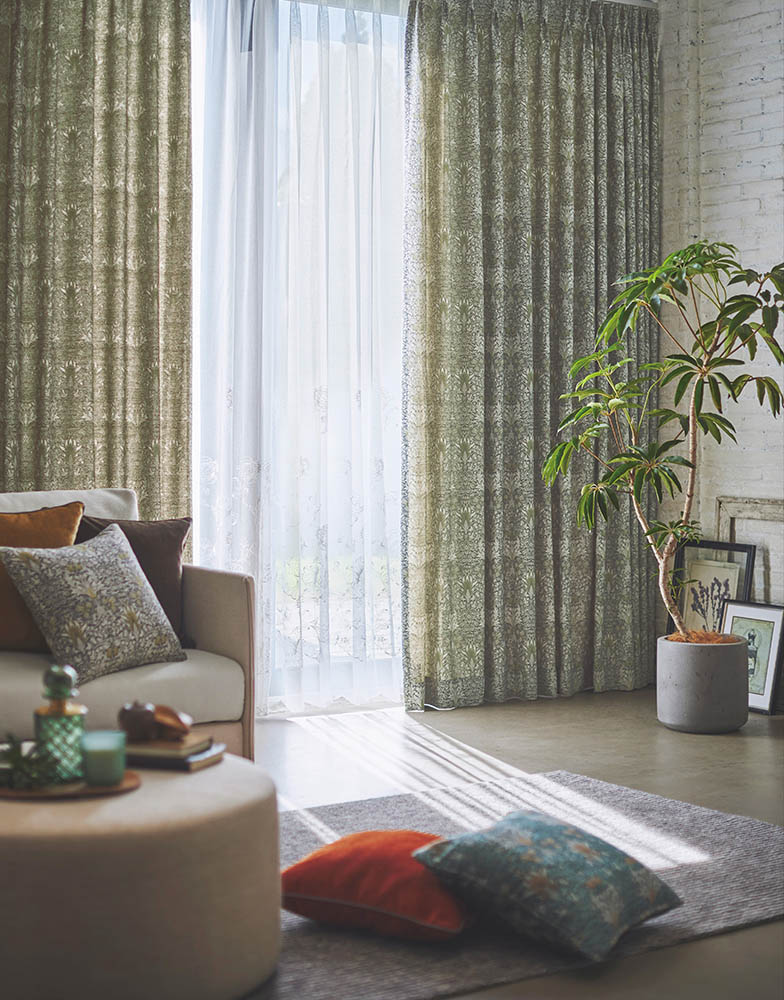 クラシックな柄を小さく使いやすい大きさにしています。意匠糸でナチュラル感を加えて、少し鮮やかな色をアクセントにして重厚過ぎないようにしました。クラシック感とモダンさのある2配色です。