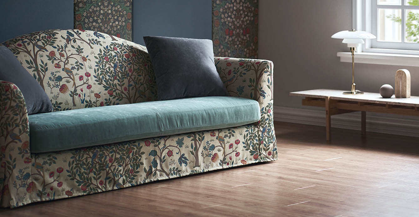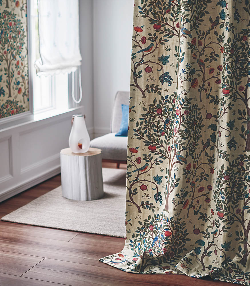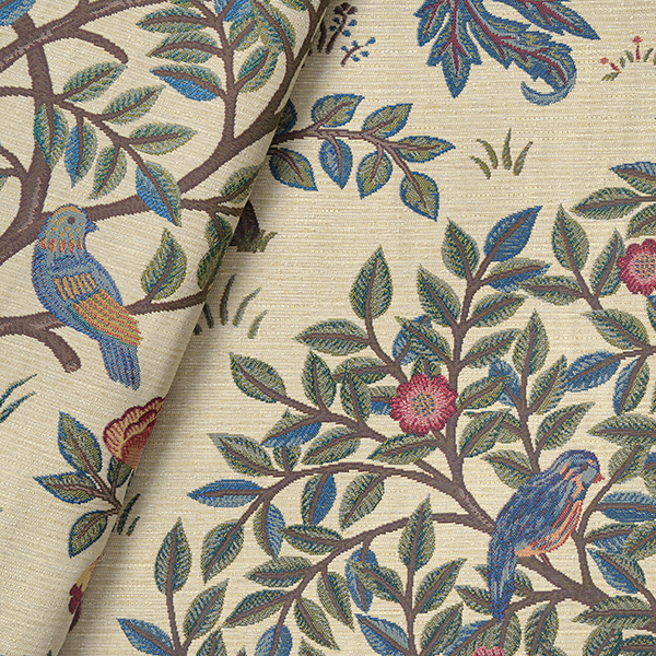 ウィリアム・モリスの次女メイが制作した、別荘「ケルムスコット・マナー」で使われていたベッド掛けをヒントに、刺繍で表現したデザインを織物にしました。同じ色調の中でも柄がより引き立つよう、ゴブラン織の手法を参考に、立体感を生み出しました。