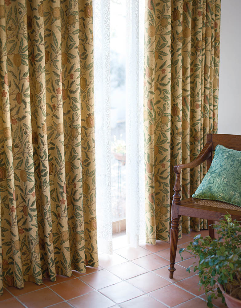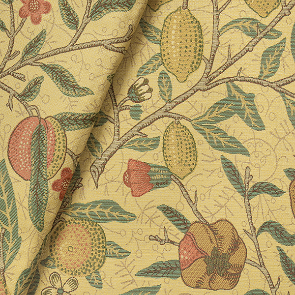 ウィリアム・モリスのデザインの中でも有名なこのフルーツの柄は、1864年にモリスが第二作目の壁紙として描いたもので、当時は版木を用いてハンドプリントされていました。版木のやわらかく味わいのあるタッチを織物で表現しています。