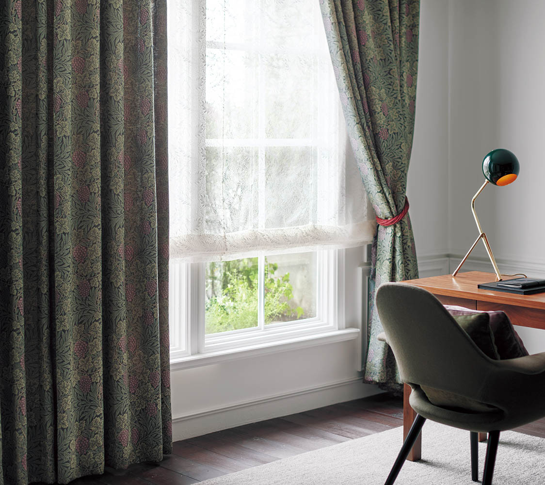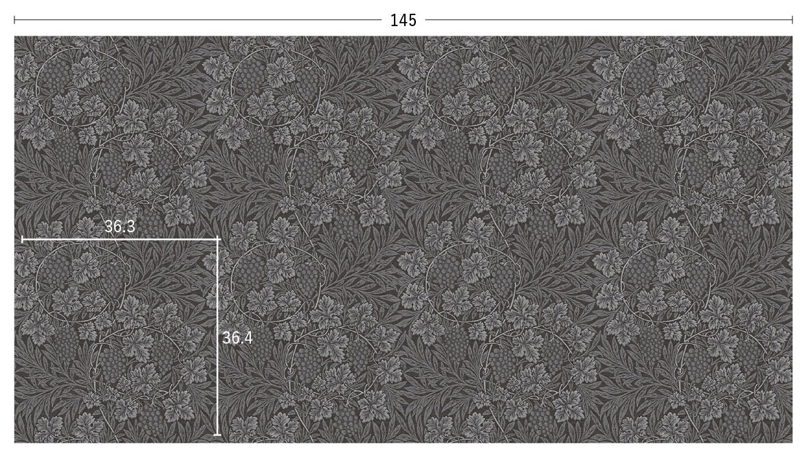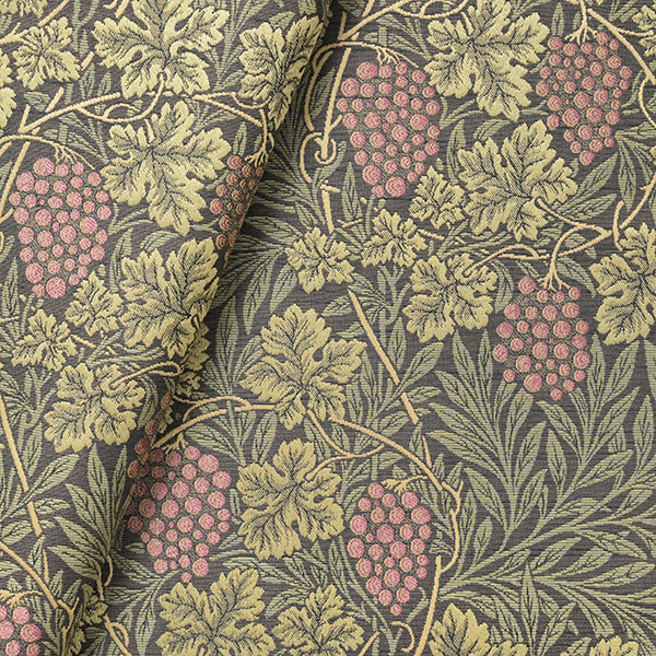 1874年に製作されたウィリアム・モリスの壁紙のデザインを織物にしました。明瞭に渦巻く葡萄の蔓のトレーサリ(モリス特有の渦巻く流れのある更紗)がモリスらしさを表現しています。葡萄の立体感を糸を工夫して表現し、深みのある織物に仕上げています。