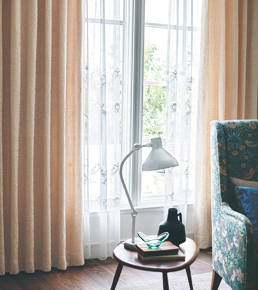 ウィリアム・モリスが1879年にハンドブロック壁紙のパターンとして生み出した、大変人気のあるデザインです。光沢のあるベースに、様々な飾り糸を織り込むことで、ドレープの美しさが引き立つ柔らかい風合いに仕上げました。レリーフ調の柄が立体的に見えながらも、無地調で使いやすいファブリックです。