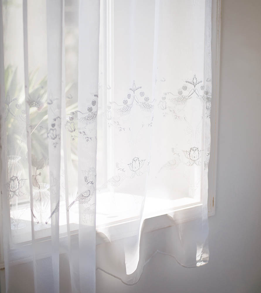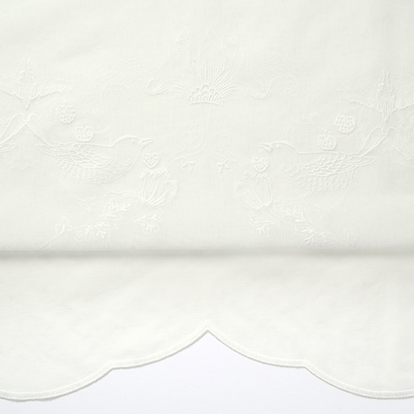 いちごをついばむツグミのモチーフの刺繍柄です。ツグミのくちばし、目、羽根を細部まで刺繍で丹念に表現しています。ドレープのMM3107、MM3108~3110と同じモチーフのペア柄です。