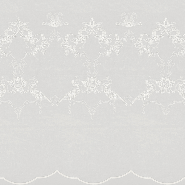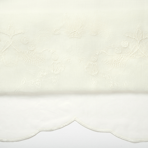 いちごをついばむツグミのモチーフの刺繍柄です。ツグミのくちばし、目、羽根を細部まで刺繍で丹念に表現しています。ドレープのMM3107、MM3108~3110と同じモチーフのペア柄です。