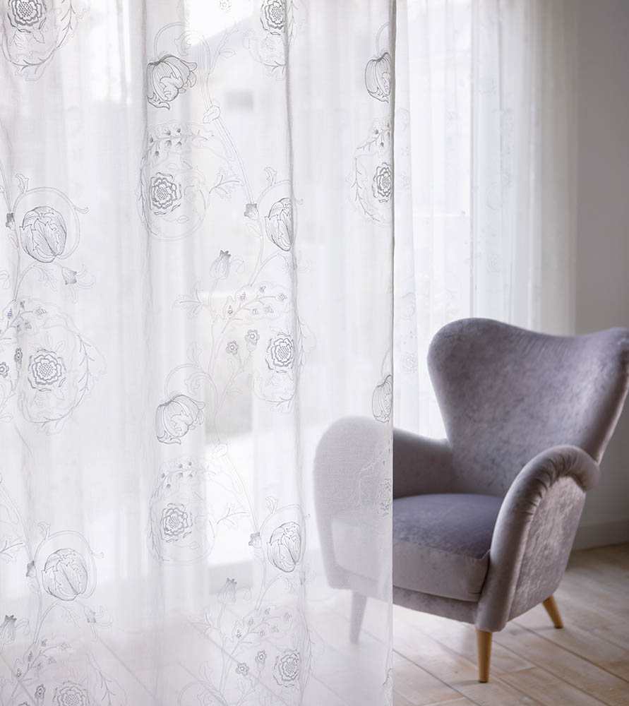 大柄なパターンを丹念な刺繍のステッチで表現しています。ドレープのMM3130・3131のペア柄です。