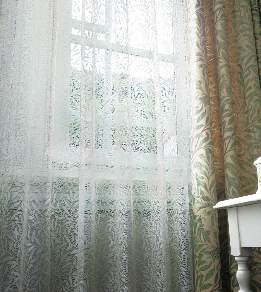 モチーフの柳の枝をボリュームのある編みレースで表現しました。同柄同士のコーディネートはもちろん、他のドレープにもマッチするレースです。ドレープのMM3113、MM3114~3116と同柄のペアレースです。
