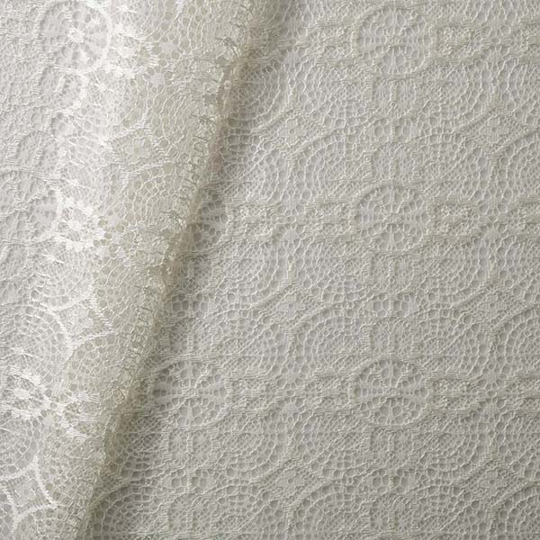 粗い編目とボリュームが特徴の懐かしさを感じるトーション風(ヨーロッパの貴族の間で袖や襟飾りに使われた)レースです。花文様のデザインが華やかさをプラスしています。窓から注ぐ光を受けた柔らかな影を楽しむことができます。