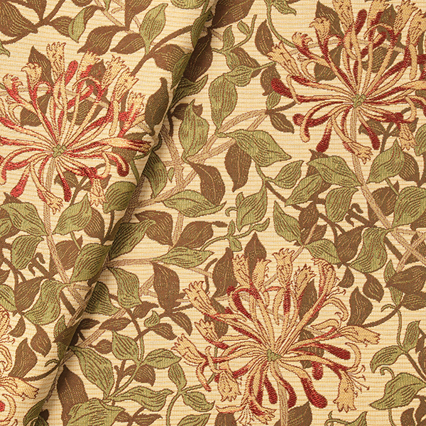 1883年にウィリアム・モリスの次女メイによって製作された壁紙のデザインを織物にしました。スイカズラの花がつる性の丸みのある細かな葉の中に見え隠れするデザインです。色糸の交織が程よい深みを与えています。