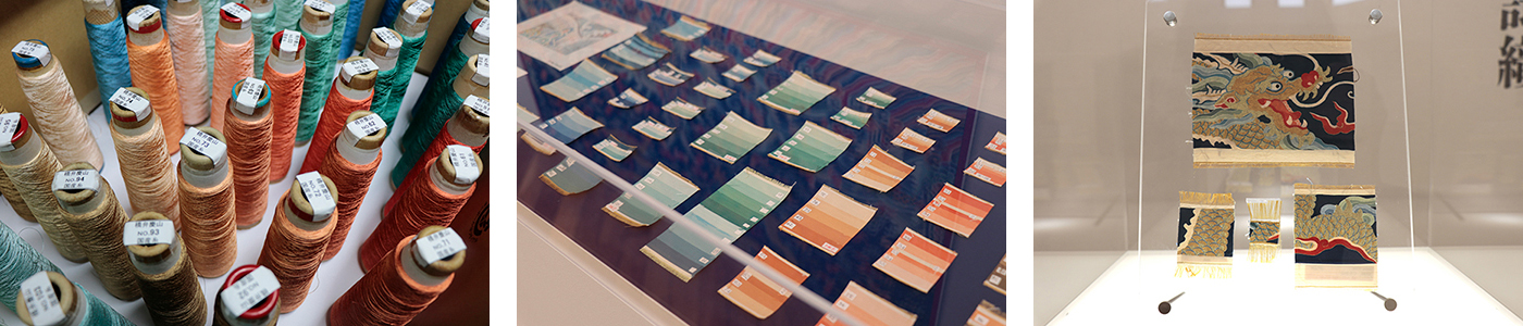 復元新調の方向性が決まると、技術者たちは、元幕の破損が比較的少ない部分の糸の色や織り、制作からの経過年数などを勘案して、色を特定していきました。通常、織物の裏面は表面に比べて変退色が少なく、元の色が判断しやすいのですが、この前懸は2012(平成24)年に表装技法で修理・額装されたため、裏面から調査を行うことができず、調査は難航しました。調査の結果、約60色の色を使用した鮮やかな原画となりました。