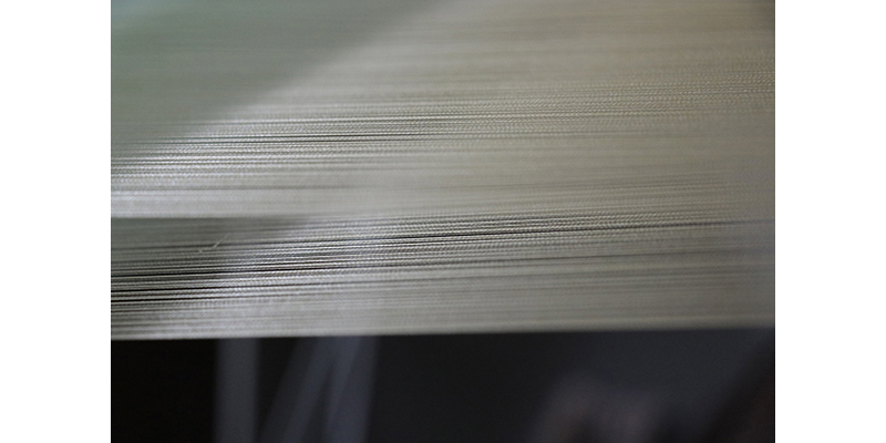原画・下絵の制作、試作を経て、色糸の染色の準備が整うといよいよ本製織です。この工程が、今回の復元新調における山場でした。その理由は、”糸の細さ”です。現在、当社で生産する綴織の帯の多くは、1寸間(約3.03cm)の幅にタテ糸が約40本ですが、橋弁慶山の前懸は、1寸間(約3.03cm)にタテ糸85本という “類例のない細かな綴織” で制作しました。今回の前懸の内寸は、幅1,230mm×高さ1,154mmあるため、タテ糸の数は約3,450本。約2年半の製織期間中、タテ糸にはテンションがかかり続けるため、タテ糸が細く、多いほど負荷がかかり、熟練した技術者であっても糸の扱いが難しくなります。
