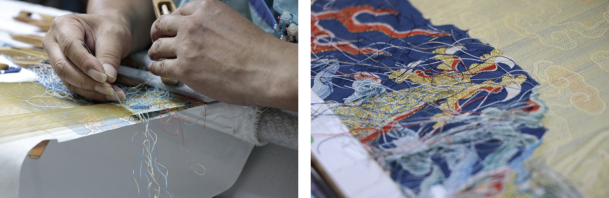 しかし、退色、ゆがみ、破損など長い年月を経た劣化が大部分に見られました。元の官服が残っている部分も少なく、左右反転の図柄とは言うものの、裂地のゆがみや傾きも多く見られました。また、左右ともに図柄のない箇所もあり、全面の図柄を再構成する必要があったため、原画・下絵の完成までに想定をはるかに超えた時間を要しました。