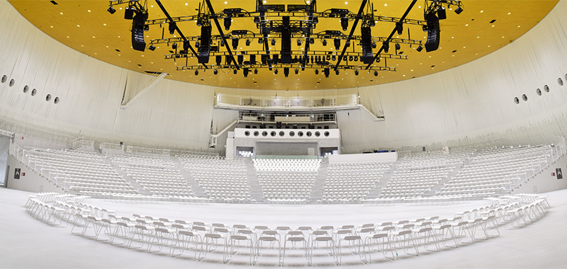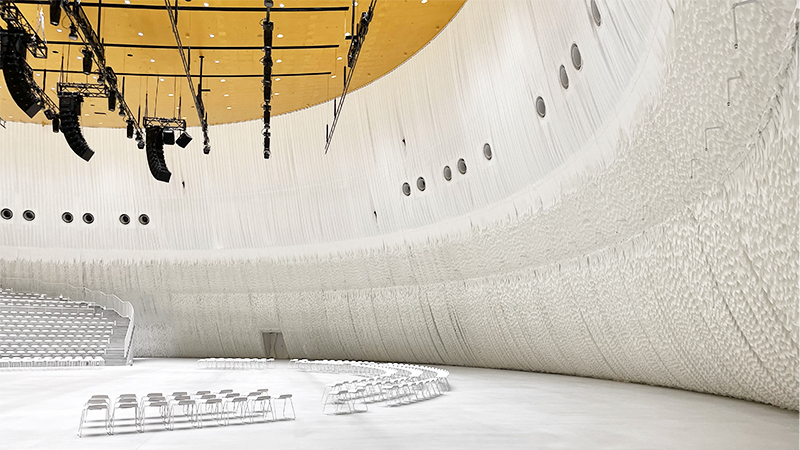 黄金の大屋根と力強い円錐形のフォルムは、1970年大阪万博の岡本太郎氏による「太陽の塔」を彷彿とさせ、今回の万博会場のシンボルの一つです。内部はセンターステージ形式の円形劇場で、観客と演者が一体となる祝祭空間が広がります。壁面全周を包むテキスタイルをはじめとし、白を基調とした内装により幻想的な雰囲気が演出されており、天井や壁面を使った大規模なプロジェクションマッピングも実施されています。