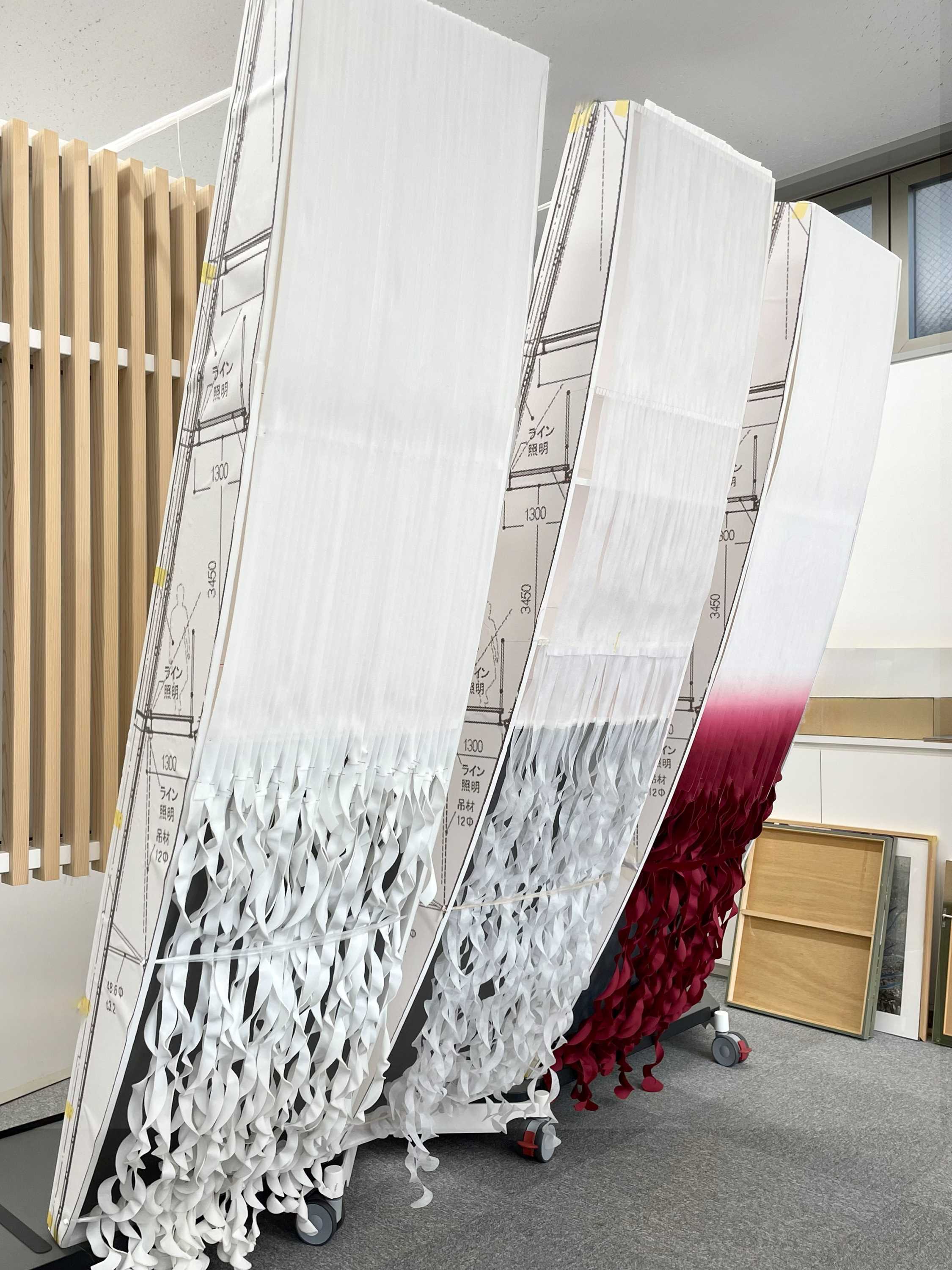 はじめて伊東豊雄建築設計事務所(以下、伊東事務所)からお話をいただいたのは、2022年6月頃でした。伊東さんは当初から建築の中で重要な要素の一つとしてテキスタイルを使用したいという想いを持っていらっしゃいました。当時は伊東事務所のさまざまなプロジェクトが同時並行で進行しており、他プロジェクトの空間とテキスタイルの在り方と、EXPOホールでのテキスタイルの存在の意味を考えながら、サンプル試作などを進めていました。具体的にテキスタイルの構想をスタートしたのは2023年春頃からです。その年の4月にはじめてプレゼン提案を行いましたが、実はこの時点から、最終的な形状に近い、捻りのある短冊状のテキスタイルをご提案していました。