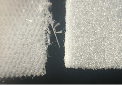 はじめに生地の選定からスタートしました。安東氏からの要望は「ベルベット調の毛足のあるタイプの生地で、短冊状のテキスタイル」。しかし、ベルベットの生地は、短冊状にカットすると端部が非常にほつれやすいという欠点がありました。代案として、スエードのような起毛感を施した編み物の一種を提案しました。伸縮性や形状安定性が高く、カット後のほつれが抑えられることが特徴の生地の表面に、スエード調の起毛を施すことで、柔らかく温かみのある風合いでありながら、シワになりにくさも兼ね備えた生地になります。さらに、起毛後に、パイル(丸いループ状の糸)の先端を平らにカットするシャーリング加工を施すことで、生地の表面が滑らかになり、独特のツヤと肌触りが生まれます。