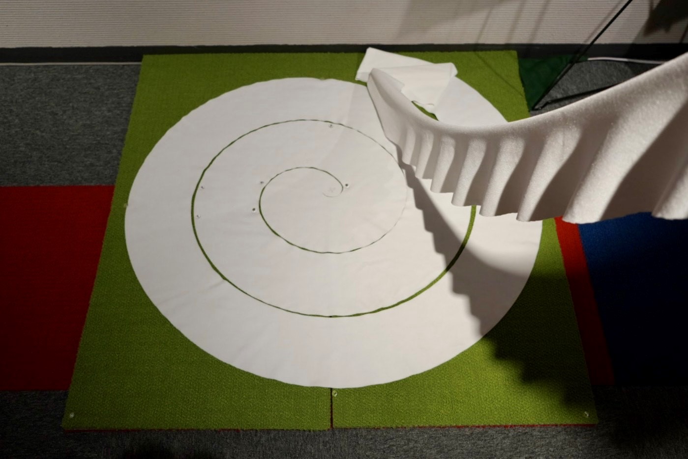 一方、どのような布で、どのように空間を満たすかは完全に手探りの状態。そんな中、安東陽子さんから「渦巻き状に切った布を垂らす」という大胆な提案を受けましたが、空間の中でどう見えるのか、どれほどの布が必要なのか、すぐには想像できませんでした。しかし1/10スケールのモックアップをつくってみたところ、空間が一変するような感覚を覚えました。布が空間に働きかける力を実感した瞬間でした。伊東とも打合せをし「よし、これでいこう」と方針が決まりました。