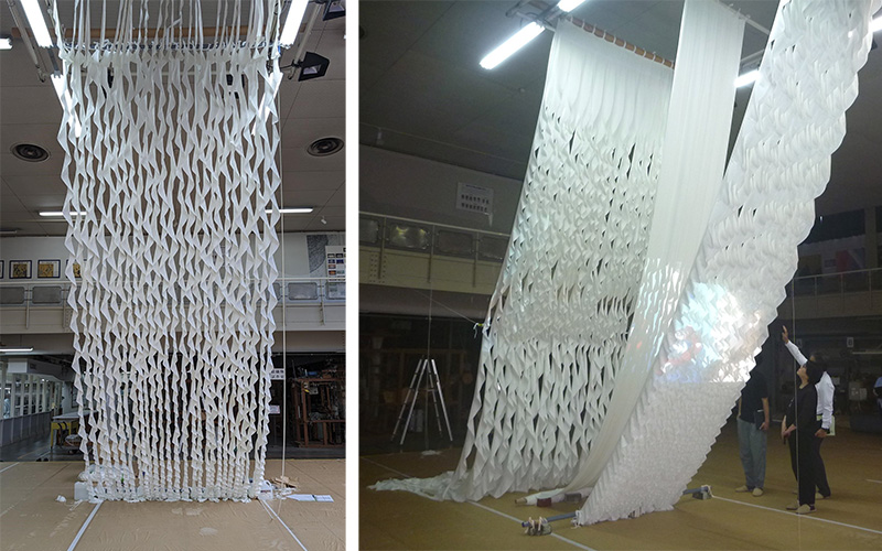 また、会場全体をプロジェクションマッピングで投影することが計画されていたため、「透けない」ということも条件の一つでした。当初想定の生地量では全く足りず透けてしまったため、背景にも生地を重ね、ツイストの生地の重なり部分も大幅に増やすことで対応しました。最終的には150cm巾の生地をなんと約8,000mも生産することとなりました。