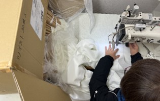 とにかく長い真っ白な生地、都度箱から出して開梱していると、生地が絡まったり、どこをどのように縫うのか迷ってしまったりするため、通常の方法では時間がかかり、ミスも発生しやすいと考えられました。