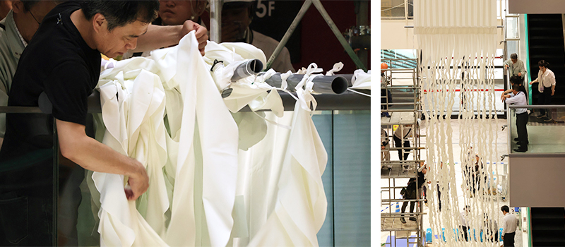 モックアップ検証で生地が絡まりうまくいかなかった時は、正直その場にいた全員がツイスト案は実現できないのではないかと諦めかけていたと思います。ただ私は今回のEXPOホールで、このツイストのテキスタイルデザインは必要不可欠と考えていたので絶対に諦められず、美しく施工できる方法を模索しました。モックアップ検証での苦労があったからこそ、実際のEXPOホールでの施工の際には、莫大な量にもかかわらず、とても美しく仕上がりました。