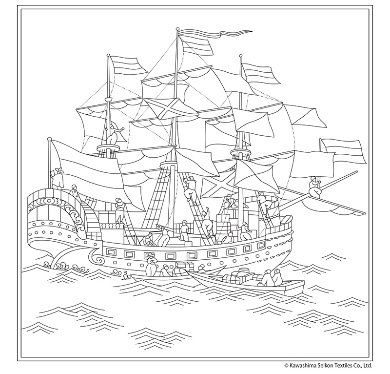 海に囲まれた島国の日本は古くから船と深いかかわりがあり、江戸時代に来航したオランダ船などの外国船は、ハイカラなモチーフとして好まれ、当時の浮世絵や工芸品などにも描かれ親しまれていたようです。華やかさ・豪華さから格調の高いイメージがあり、現在でも着物や帯でよく見られる柄の一つです 。